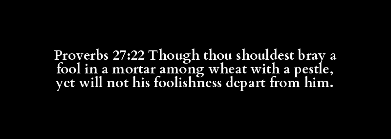 Proverbs 27:22 Though thou shouldest bray a fool in a mortar among wheat with a pestle, yet will not his foolishness depart from him.