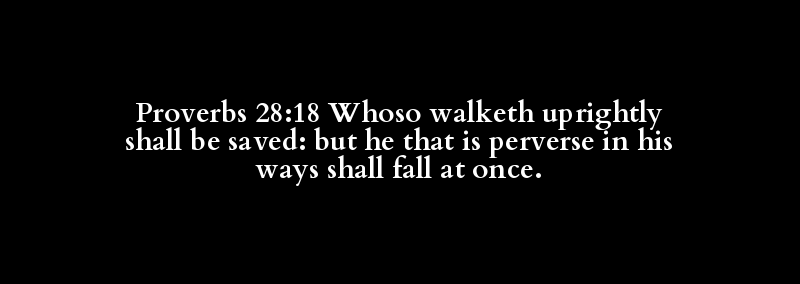 Proverbs 28:18 Whoso walketh uprightly shall be saved: but he that is perverse in his ways shall fall at once.