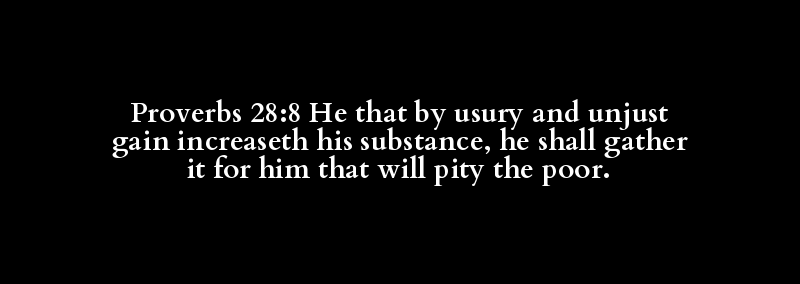 Proverbs 28:8 He that by usury and unjust gain increaseth his substance, he shall gather it for him that will pity the poor.