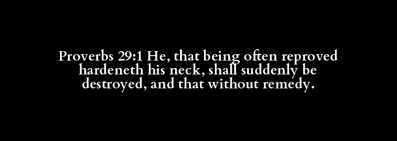 Proverbs 29:1 He, that being often reproved hardeneth his neck, shall suddenly be destroyed, and that without remedy.
