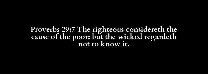 Proverbs 29:7 The righteous considereth the cause of the poor: but the wicked regardeth not to know it.