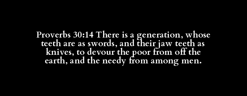 Proverbs 30:14 There is a generation, whose teeth are as swords, and their jaw teeth as knives, to devour the poor from off the earth, and the needy from among men.