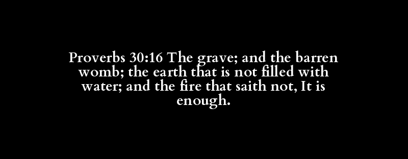 Proverbs 30:16 The grave; and the barren womb; the earth that is not filled with water; and the fire that saith not, It is enough.