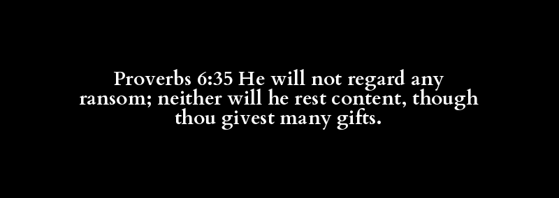 Proverbs 6:35 He will not regard any ransom; neither will he rest content, though thou givest many gifts.