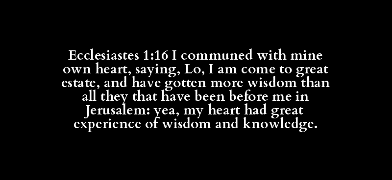 Ecclesiastes 1:16 I communed with mine own heart, saying, Lo, I am come to great estate, and have gotten more wisdom than all they that have been before me in Jerusalem: yea, my heart had great experience of wisdom and knowledge.
