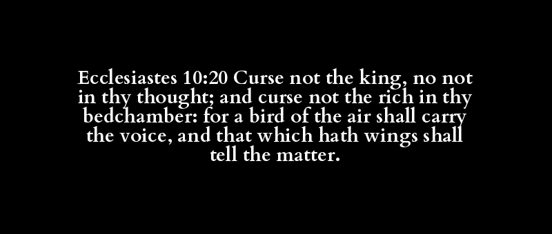 Ecclesiastes 10:20 Curse not the king, no not in thy thought; and curse not the rich in thy bedchamber: for a bird of the air shall carry the voice, and that which hath wings shall tell the matter.