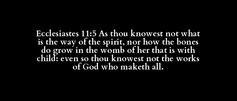Ecclesiastes 11:5 As thou knowest not what is the way of the spirit, nor how the bones do grow in the womb of her that is with child: even so thou knowest not the works of God who maketh all.