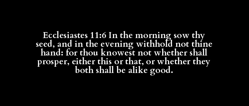 Ecclesiastes 11:6 In the morning sow thy seed, and in the evening withhold not thine hand: for thou knowest not whether shall prosper, either this or that, or whether they both shall be alike good.