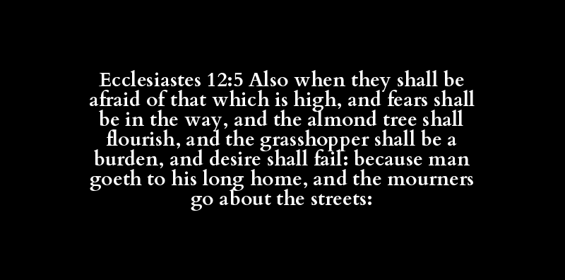 Ecclesiastes 12:5 Also when they shall be afraid of that which is high, and fears shall be in the way, and the almond tree shall flourish, and the grasshopper shall be a burden, and desire shall fail: because man goeth to his long home, and the mourners go about the streets: