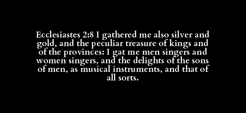 Ecclesiastes 2:8 I gathered me also silver and gold, and the peculiar treasure of kings and of the provinces: I gat me men singers and women singers, and the delights of the sons of men, as musical instruments, and that of all sorts.