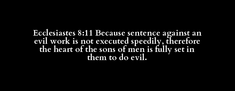Ecclesiastes 8:11 Because sentence against an evil work is not executed speedily, therefore the heart of the sons of men is fully set in them to do evil.