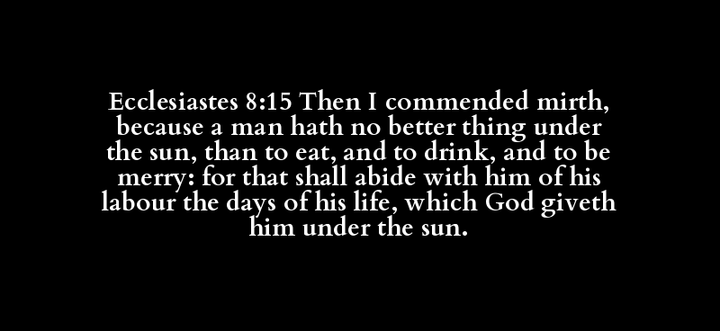 Ecclesiastes 8:15 Then I commended mirth, because a man hath no better thing under the sun, than to eat, and to drink, and to be merry: for that shall abide with him of his labour the days of his life, which God giveth him under the sun.