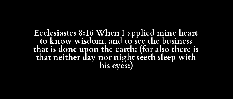 Ecclesiastes 8:16 When I applied mine heart to know wisdom, and to see the business that is done upon the earth: (for also there is that neither day nor night seeth sleep with his eyes:)