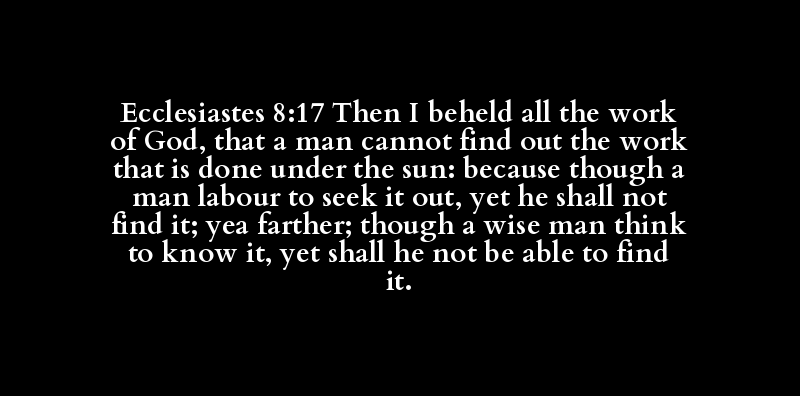 Ecclesiastes 8:17 Then I beheld all the work of God, that a man cannot find out the work that is done under the sun: because though a man labour to seek it out, yet he shall not find it; yea farther; though a wise man think to know it, yet shall he not be able to find it.