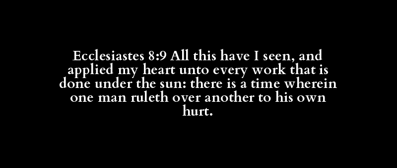 Ecclesiastes 8:9 All this have I seen, and applied my heart unto every work that is done under the sun: there is a time wherein one man ruleth over another to his own hurt.