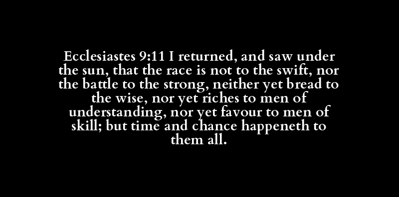 Ecclesiastes 9:11 I returned, and saw under the sun, that the race is not to the swift, nor the battle to the strong, neither yet bread to the wise, nor yet riches to men of understanding, nor yet favour to men of skill; but time and chance happeneth to them all.