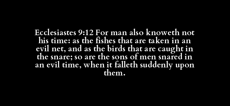 Ecclesiastes 9:12 For man also knoweth not his time: as the fishes that are taken in an evil net, and as the birds that are caught in the snare; so are the sons of men snared in an evil time, when it falleth suddenly upon them.