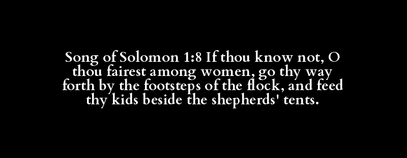 Song of Solomon 1:8 If thou know not, O thou fairest among women, go thy way forth by the footsteps of the flock, and feed thy kids beside the shepherds' tents.