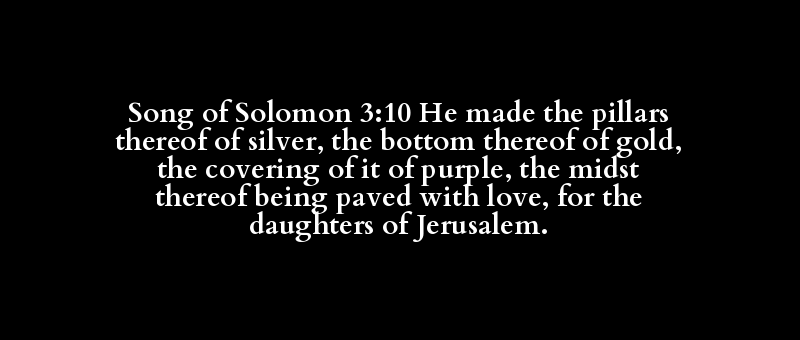 Song of Solomon 3:10 He made the pillars thereof of silver, the bottom thereof of gold, the covering of it of purple, the midst thereof being paved with love, for the daughters of Jerusalem.