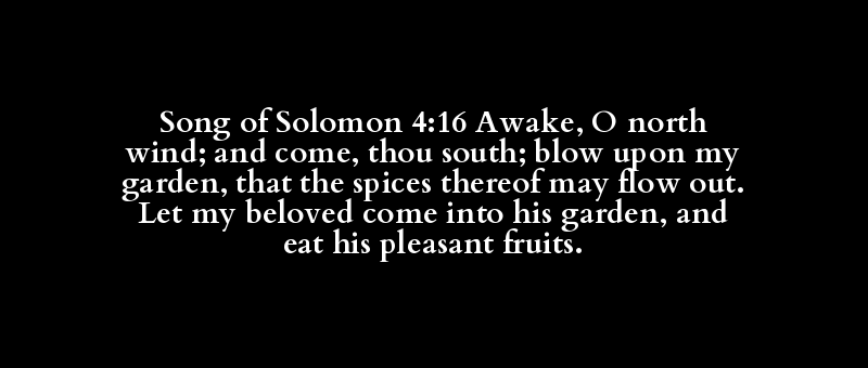 Song of Solomon 4:16 Awake, O north wind; and come, thou south; blow upon my garden, that the spices thereof may flow out. Let my beloved come into his garden, and eat his pleasant fruits.