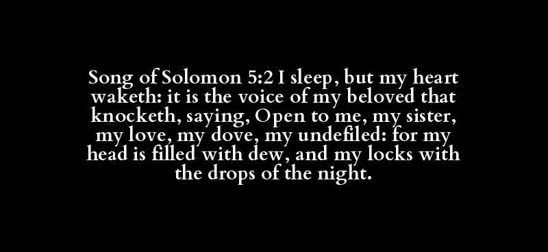 Song of Solomon 5:2 I sleep, but my heart waketh: it is the voice of my beloved that knocketh, saying, Open to me, my sister, my love, my dove, my undefiled: for my head is filled with dew, and my locks with the drops of the night.