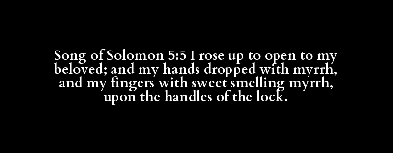 Song of Solomon 5:5 I rose up to open to my beloved; and my hands dropped with myrrh, and my fingers with sweet smelling myrrh, upon the handles of the lock.