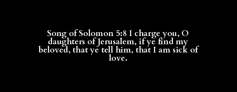 Song of Solomon 5:8 I charge you, O daughters of Jerusalem, if ye find my beloved, that ye tell him, that I am sick of love.