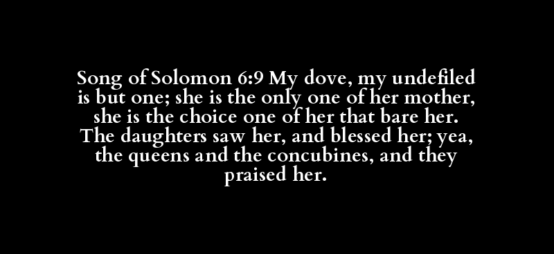Song of Solomon 6:9 My dove, my undefiled is but one; she is the only one of her mother, she is the choice one of her that bare her. The daughters saw her, and blessed her; yea, the queens and the concubines, and they praised her.
