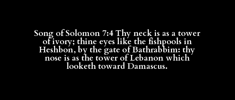 Song of Solomon 7:4 Thy neck is as a tower of ivory; thine eyes like the fishpools in Heshbon, by the gate of Bathrabbim: thy nose is as the tower of Lebanon which looketh toward Damascus.