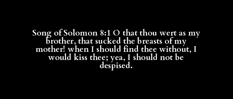 Song of Solomon 8:1 O that thou wert as my brother, that sucked the breasts of my mother! when I should find thee without, I would kiss thee; yea, I should not be despised.