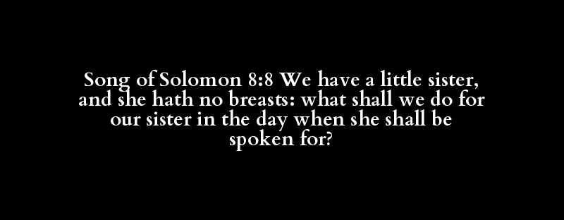 Song of Solomon 8:8 We have a little sister, and she hath no breasts: what shall we do for our sister in the day when she shall be spoken for?