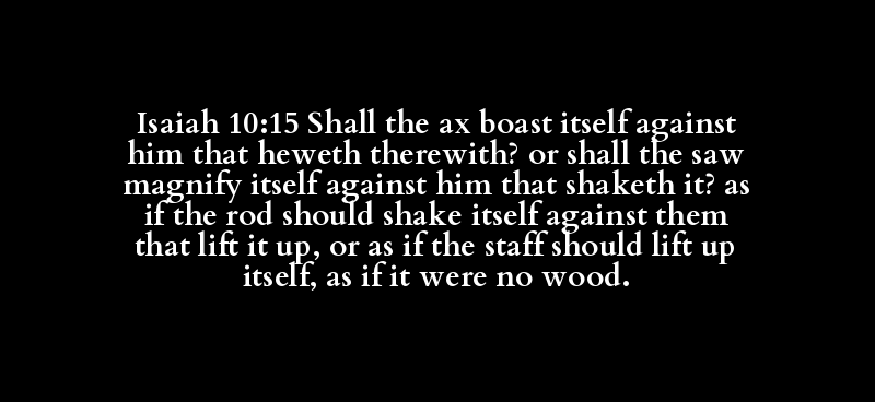 Isaiah 10:15 Shall the ax boast itself against him that heweth therewith? or shall the saw magnify itself against him that shaketh it? as if the rod should shake itself against them that lift it up, or as if the staff should lift up itself, as if it were no wood.