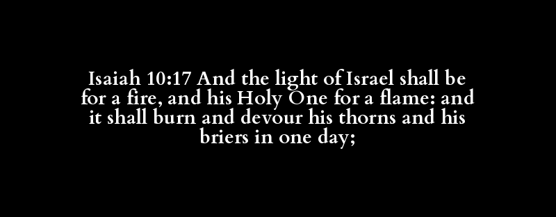 Isaiah 10:17 And the light of Israel shall be for a fire, and his Holy One for a flame: and it shall burn and devour his thorns and his briers in one day;