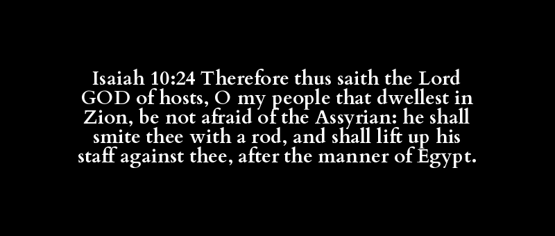 Isaiah 10:24 Therefore thus saith the Lord GOD of hosts, O my people that dwellest in Zion, be not afraid of the Assyrian: he shall smite thee with a rod, and shall lift up his staff against thee, after the manner of Egypt.