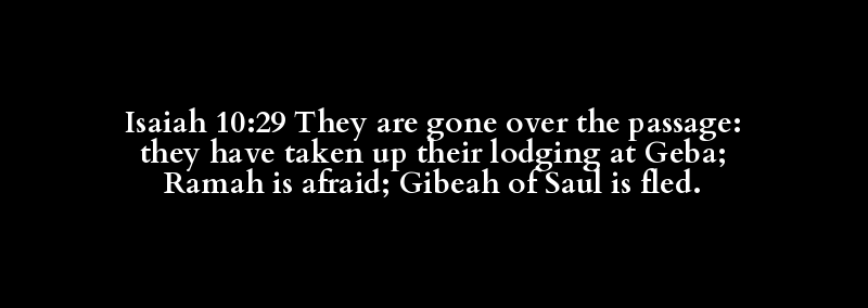 Isaiah 10:29 They are gone over the passage: they have taken up their lodging at Geba; Ramah is afraid; Gibeah of Saul is fled.