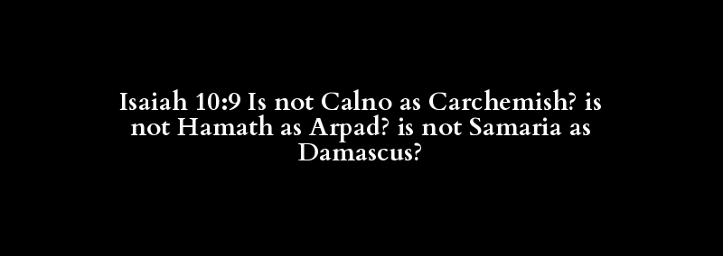 | Calneh, Calno | Carchemish | Hamath, Hemath | Arpad, Arphad | Samaria | Damascus |