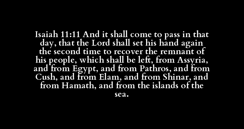 Isaiah 11:11 And it shall come to pass in that day, that the Lord shall set his hand again the second time to recover the remnant of his people, which shall be left, from Assyria, and from Egypt, and from Pathros, and from Cush, and from Elam, and from Shinar, and from Hamath, and from the islands of the sea.
