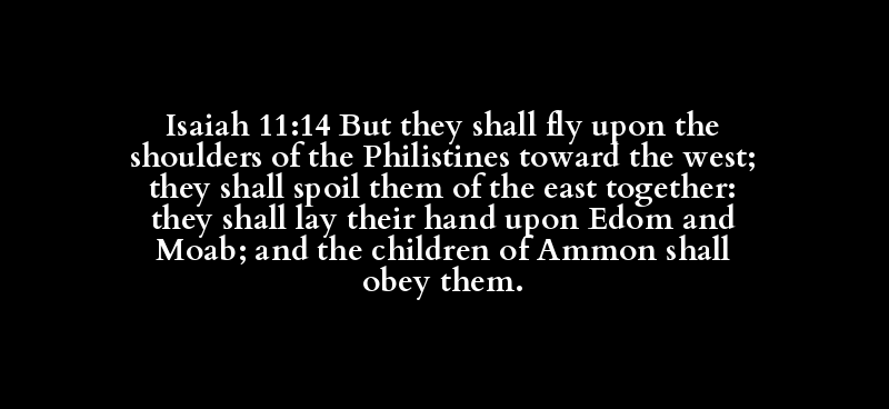 Isaiah 11:14 But they shall fly upon the shoulders of the Philistines toward the west; they shall spoil them of the east together: they shall lay their hand upon Edom and Moab; and the children of Ammon shall obey them.