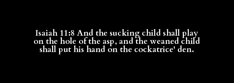 Isaiah 11:8 And the sucking child shall play on the hole of the asp, and the weaned child shall put his hand on the cockatrice' den.