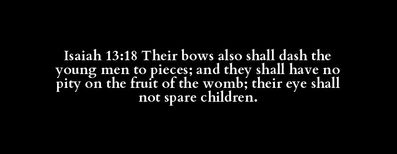 Isaiah 13:18 Their bows also shall dash the young men to pieces; and they shall have no pity on the fruit of the womb; their eye shall not spare children.