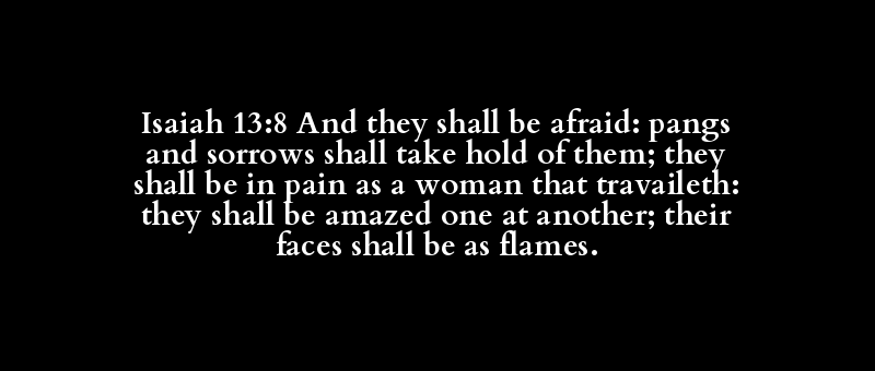 Isaiah 13:8 And they shall be afraid: pangs and sorrows shall take hold of them; they shall be in pain as a woman that travaileth: they shall be amazed one at another; their faces shall be as flames.