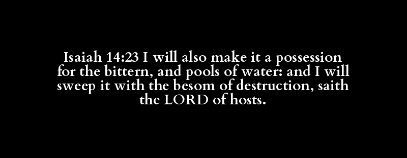 Isaiah 14:23 I will also make it a possession for the bittern, and pools of water: and I will sweep it with the besom of destruction, saith the LORD of hosts.