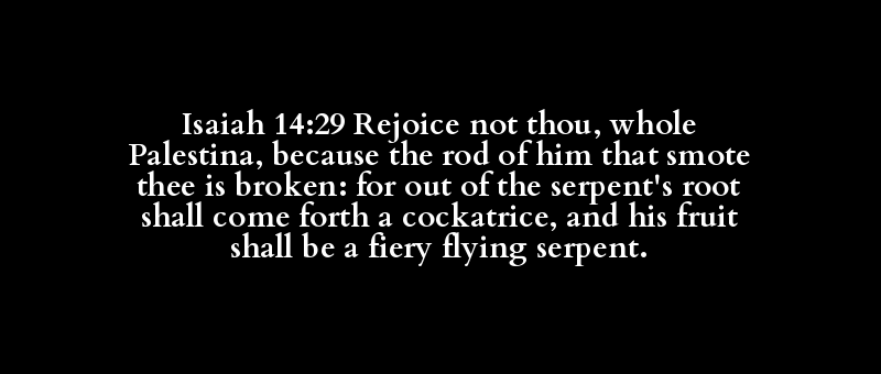 Isaiah 14:29 Rejoice not thou, whole Palestina, because the rod of him that smote thee is broken: for out of the serpent's root shall come forth a cockatrice, and his fruit shall be a fiery flying serpent.