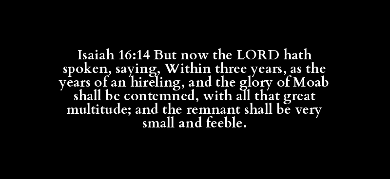 Isaiah 16:14 But now the LORD hath spoken, saying, Within three years, as the years of an hireling, and the glory of Moab shall be contemned, with all that great multitude; and the remnant shall be very small and feeble.