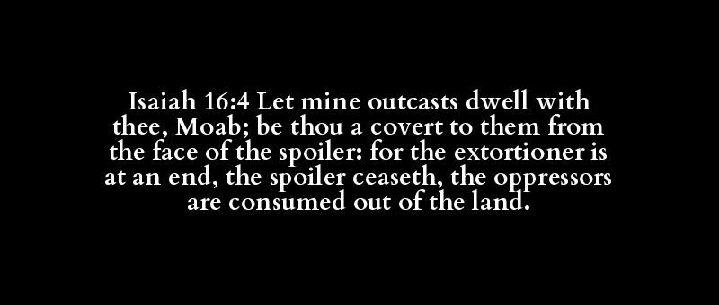 Isaiah 16:4 Let mine outcasts dwell with thee, Moab; be thou a covert to them from the face of the spoiler: for the extortioner is at an end, the spoiler ceaseth, the oppressors are consumed out of the land.