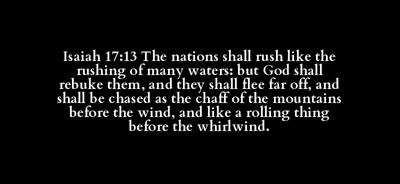 Isaiah 17:13 The nations shall rush like the rushing of many waters: but God shall rebuke them, and they shall flee far off, and shall be chased as the chaff of the mountains before the wind, and like a rolling thing before the whirlwind.
