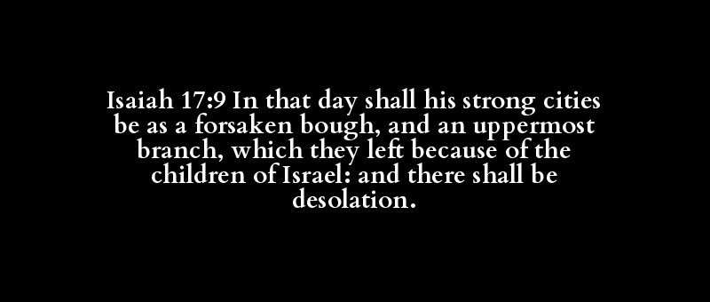 Isaiah 17:9 In that day shall his strong cities be as a forsaken bough, and an uppermost branch, which they left because of the children of Israel: and there shall be desolation.