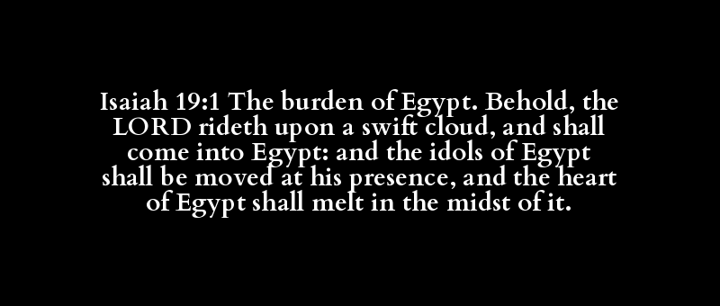 Isaiah 19:1 The burden of Egypt. Behold, the LORD rideth upon a swift cloud, and shall come into Egypt: and the idols of Egypt shall be moved at his presence, and the heart of Egypt shall melt in the midst of it.