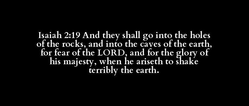Isaiah 2:19 And they shall go into the holes of the rocks, and into the caves of the earth, for fear of the LORD, and for the glory of his majesty, when he ariseth to shake terribly the earth.