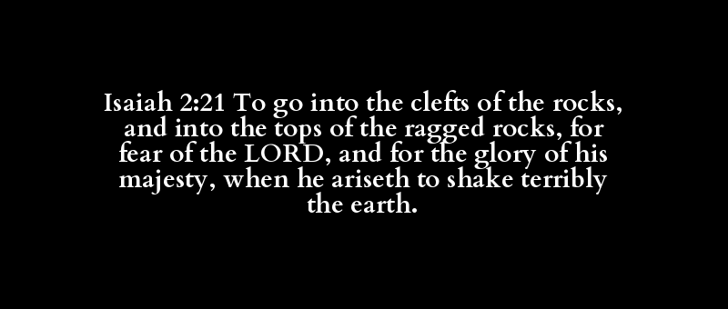 Isaiah 2:21 To go into the clefts of the rocks, and into the tops of the ragged rocks, for fear of the LORD, and for the glory of his majesty, when he ariseth to shake terribly the earth.